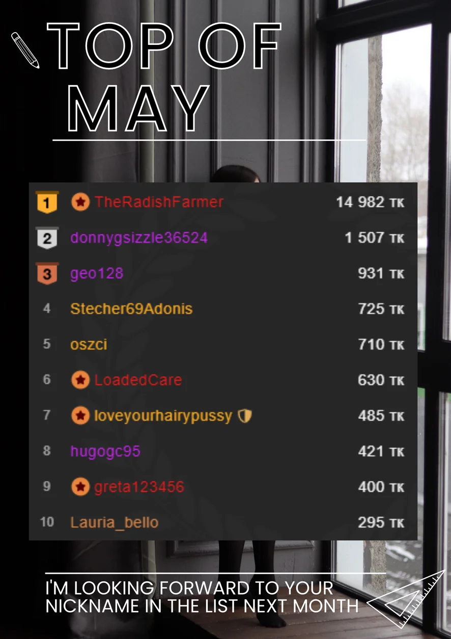 Plieskanie po zadku, Erotický tanec, Zárez, Sprosté reči, Exhibicionizmus, Odzadu, Bozkávanie, Pohľad pod sukňu, ORGASM + 200tks, PLAY WITH DILDO + 200tks, BE NAKED + 100tks, Fajčenie, Prstovanie, Orál, Twerk, Medzi kozy, Dildo alebo vibrátor, Masturbácia, Hore bez, Orgazmus, Striptíz