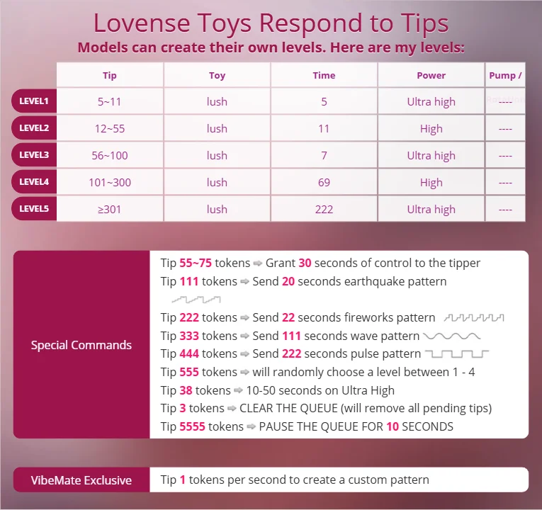 Twerk, Hore bez, Medzi kozy, Striekanie, Ahegao, Orál, Zárez, Hlboký orál, Dildo alebo vibrátor, Odzadu, Foot fetiš, Podpätky, Pokyny na honenie, Masturbácia, Olejová šou, Anál, Zo zadku do úst, Erotický tanec, Dvojitá penetrácia, Sprosté reči, Prstovanie, Orgazmus, Sexuálne hračky, Fajčenie, Striptíz