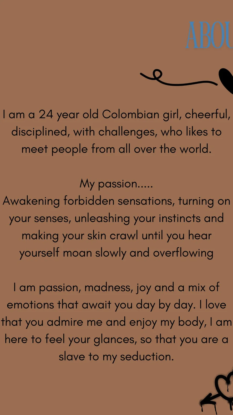 Soy pasion, locura, alegria y una mezcla de emociones que te esperan día a día. Me encanta que me admires y disfrutes mi cuerpo, estoy aqui para sentir tus miradas, para que seas exclavo de mi seduccion.