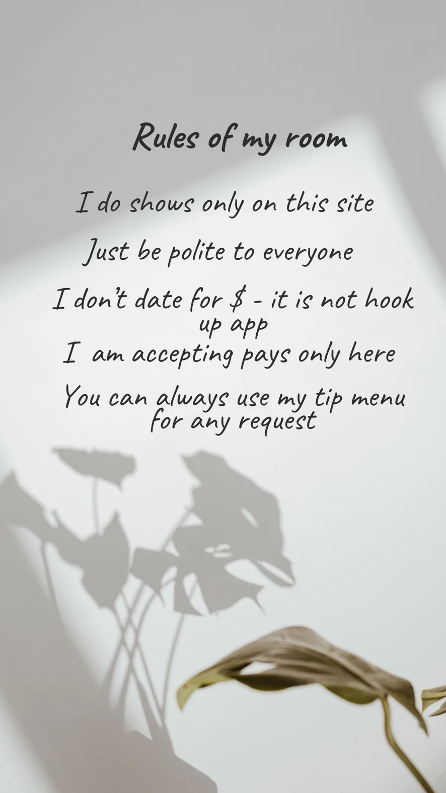 Any disrespectful behavior will result in a ban from my chat room. If you see someone behaving inappropriately, please let me know.