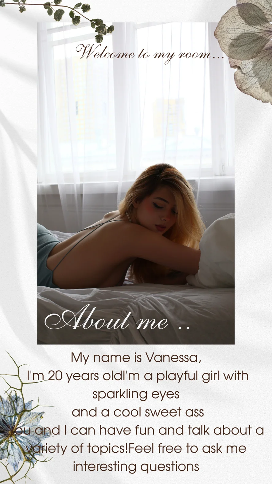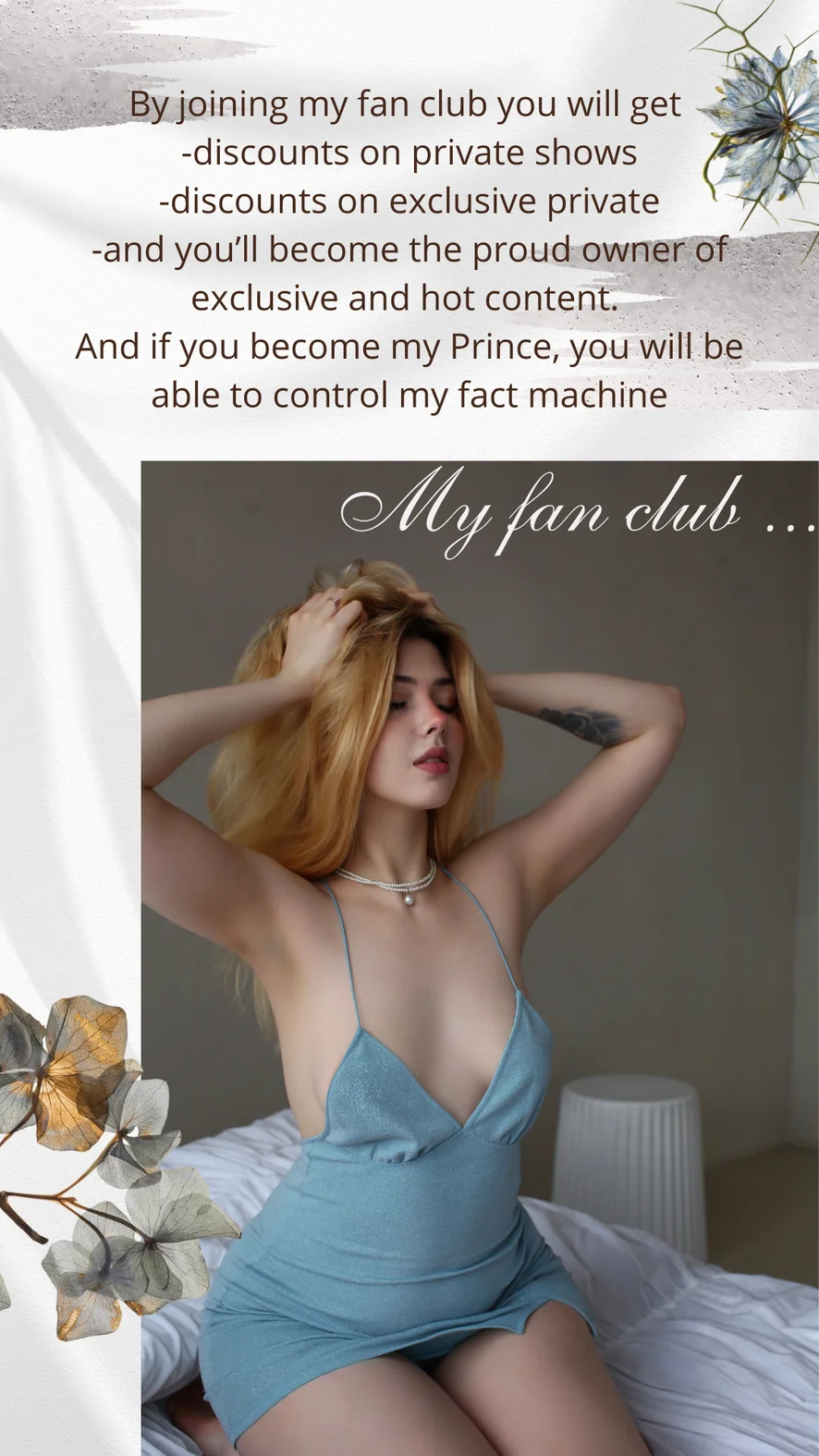 Sprosté reči, Fajčenie, Joga, Korzet, Odzadu, Erotický tanec, Olejová šou, Plieskanie po zadku, Podpätky, Foot fetiš, Ahegao, Twerk, Pokyny na honenie, Hardcore, Dildo alebo vibrátor, Creampie, Paroháči, Ponižovanie, Striptíz, Hore bez, Roleplay, Pohľad pod sukňu, Orál, Zárez, Honenie, Prstovanie, Masturbácia, Orgazmus, Sexuálne hračky, Hodnotenie vtáka, Hlboký orál