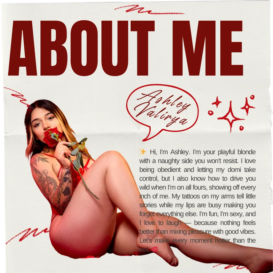 ✨ Hi, I’m Ashley. I’m your playful blonde with a naughty side you won’t resist. I love being obedient and letting my domi take control, but I also know how to drive you wild when I’m on all fours, showing off every inch of me. My tattoos on my arms tell little stories while my lips are busy making you forget everything else. I’m fun, I’m sexy, and I love to laugh — because nothing feels better than mixing pleasure with good vibes. Let’s make every moment hotter than the last. 💋